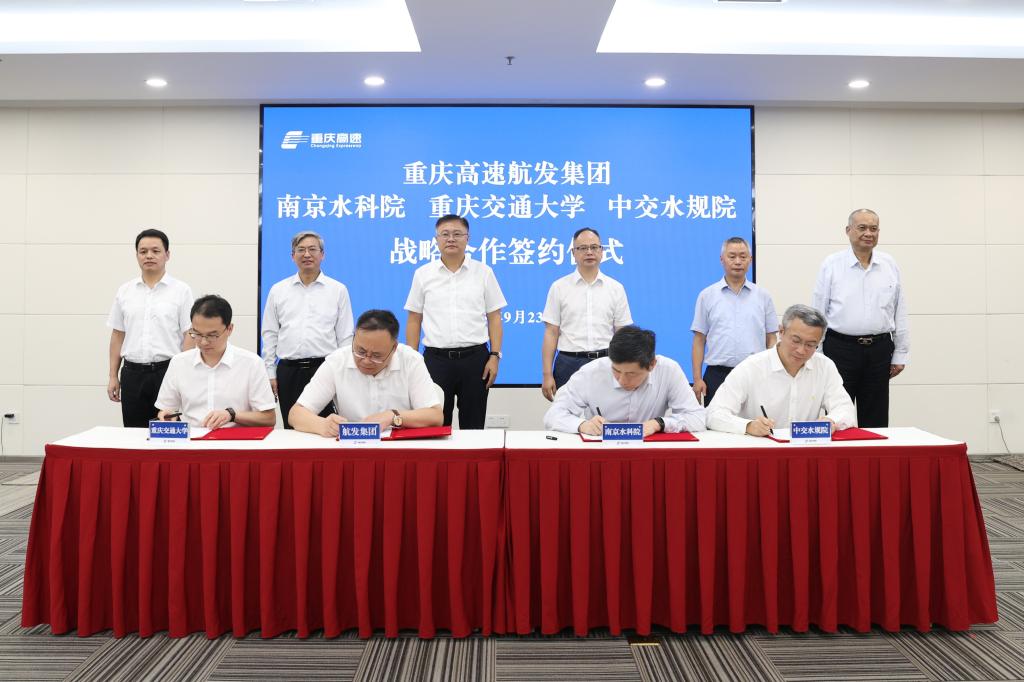 为深化产学研合作,更好服务行业和地方经济社会建设发展,重庆交通大学与重庆航运建设发展(集团)有限公司(以下称“航发集团”),秉承“面向未来、加强合作、优势互补、互利共赢”的原则,就建立校企全面战略合作关系达成一致。2025年9月23日下午,重庆高速航发集团与重庆交通大学、南京水利科学研究院、中交水运规划设计院有限公司三家单位在重庆高速集团举行了战略合作协议签约仪式。中国工程院院士胡亚安、重庆市国资委二级巡视员罗旭、重庆交通大学副校长杨胜发、南京水利科学研究院副院长潘军宁、中交水运规划设计院有限公司总经理潘海涛、全国工程勘察设计大师吴澎、重庆高速集团总经理王峙,副总经理胡旭辉和航发集团董事长廖劲松出席了战略合作签约仪式。我校产学研合作处处长吴磊,河海学院党委书记叶四桥、院长梁越,西科所副所长(主持工作)袁浩等相关部门负责人参加了签约仪式。